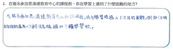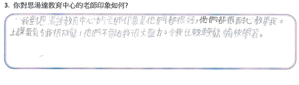 ★ 基本語法應用方面,導師會根據學生的語法水平,講解學生所不明白的語法概念,例如不同的常用句式,繼而提供相關程度的練習,好讓學生熟習所學的語法知識。對於大部分基礎較弱的學生而言,他們的語法概念不清,以致往往都難以提升考試成績。而思湯達中心的課堂講解部分有助學生釐清他們的語法概念,學生若釐清後再做相關的練習便事半功倍了。